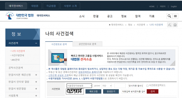 • 검색 조건 설정 (법원, 사건번호, 당사자명 등)