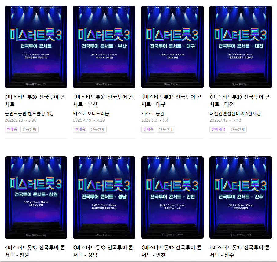 대한민국을 뜨겁게 달군 미스터트롯3의 감동이 전국투어 콘서트로 이어집니다! 시청자들의 마음을 사로잡은 TOP7의 특별한 무대를 직접 만나볼 수 있는 기회, 놓치지 마세요.