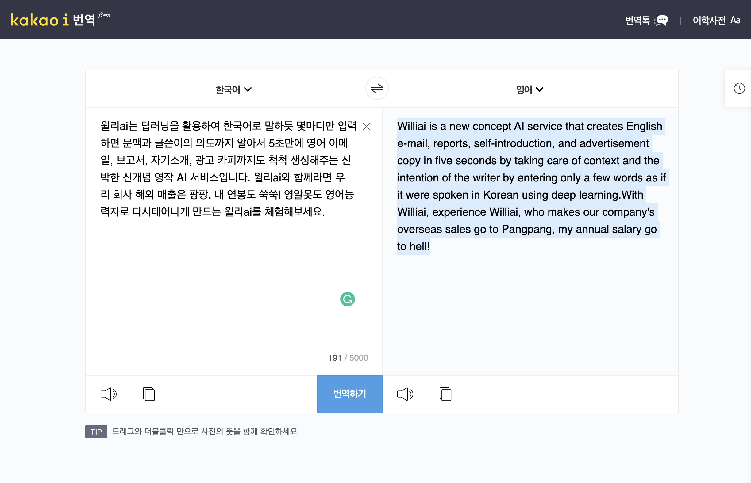 카카오 번역기의 AI는 문맥을 이해하고 자연스러운 번역을 제공합니다. 이는 DeepL과 같은 세계적인 번역 도구들과 견줄 만한 수준입니다.