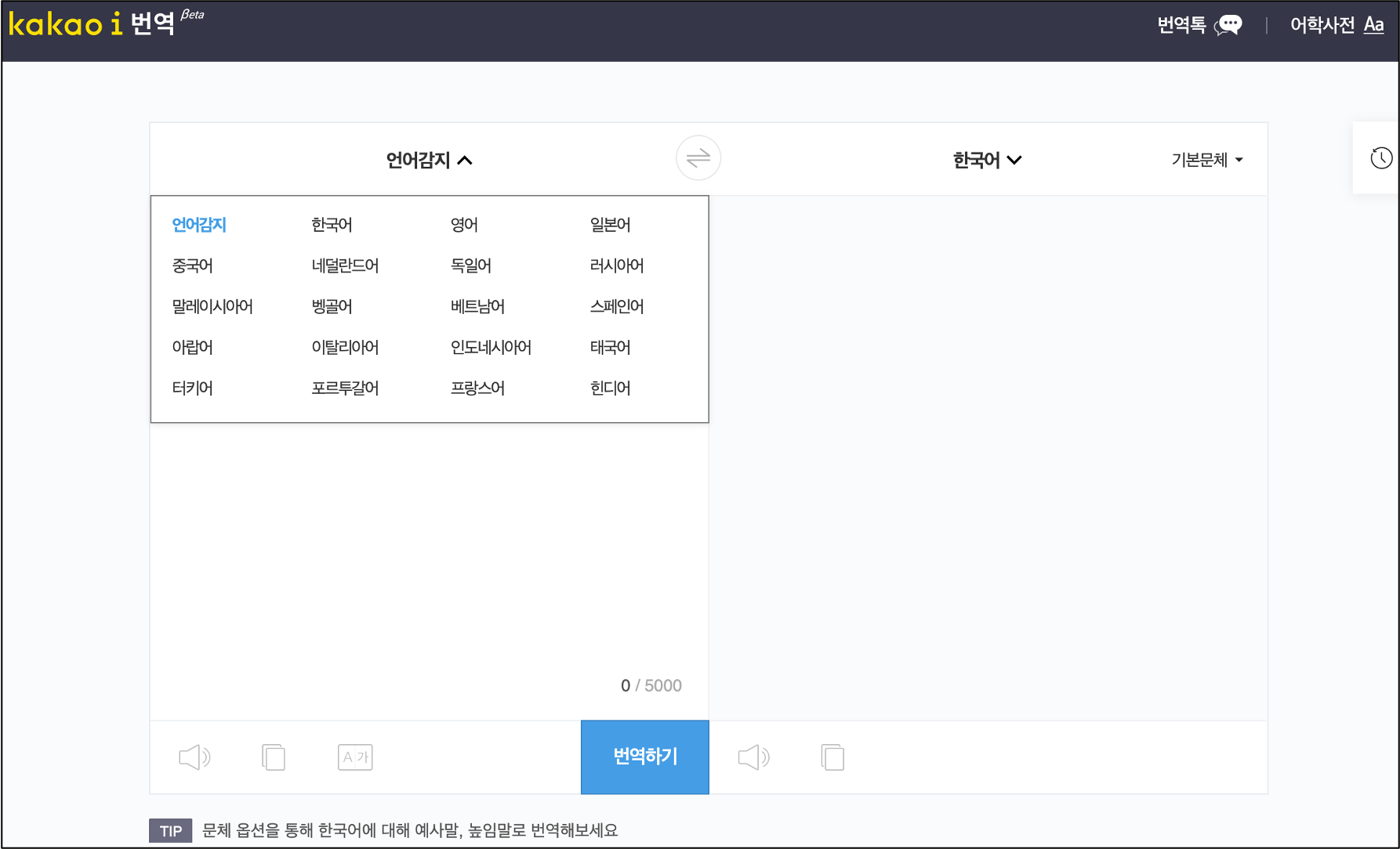 카카오 번역기는 영어, 일본어, 중국어를 비롯한 다양한 언어를 지원합니다. Ethnologue에 따르면, 전 세계에서 가장 많이 사용되는 언어들을 모두 커버하고 있습니다.