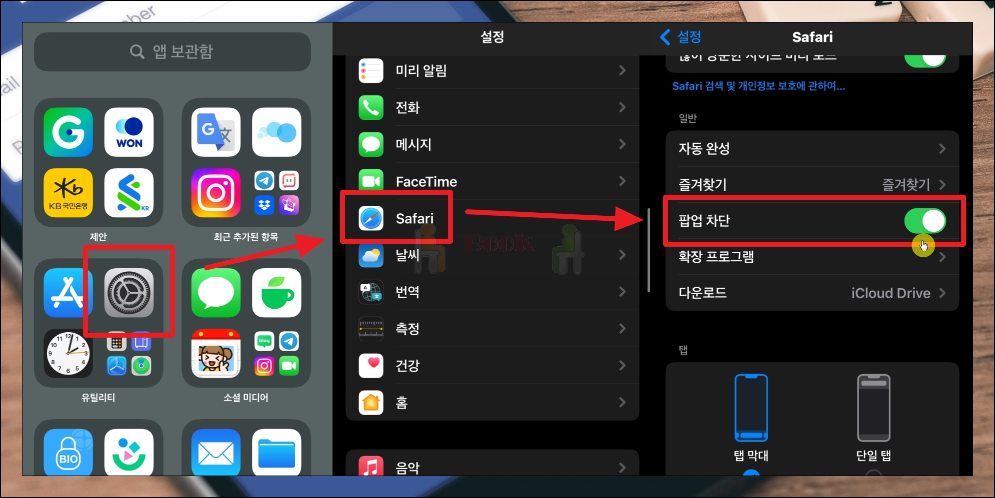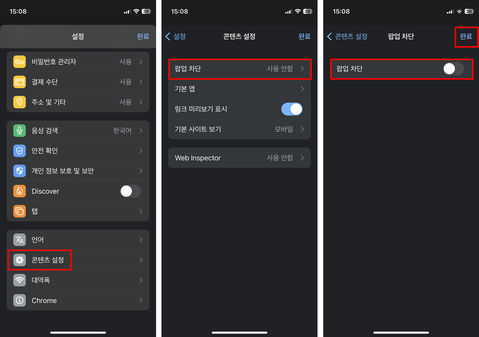 - '설정' 앱 → 'Safari' → '팝업 차단' 토글 스위치 조정