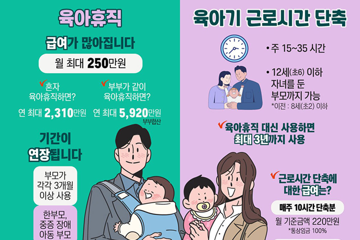 만 12세 이하 자녀를 둔 근로자는 최대 3년간 근로시간 단축을 신청할 수 있게 되었습니다. 기존 3개월 단위에서 1개월 단위로 사용 기간이 세분화되어, 더욱 유연한 근무 조정이 가능해졌습니다. 이는 자녀의 학교생활이나 특별한 돌봄이 필요한 시기에 맞춰 탄력적으로 운영할 수 있다는 장점이 있습니다.